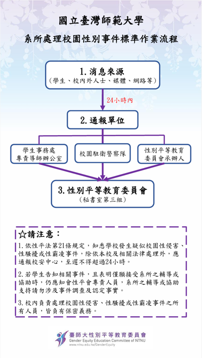 3.National Taiwan Normal University Regulations on the Prevention and Handling of Gender Discrimination, Sexual Assault, Sexual Harassment, and Sexual Bullying: