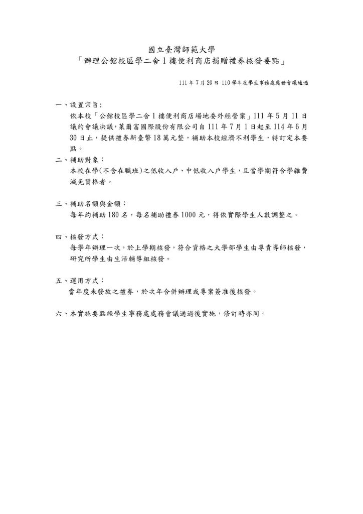 Guidelines for Issuing Donated Gift Vouchers at the Gongguan Campus Dormitory Store that subsidizing economically disadvantaged students.