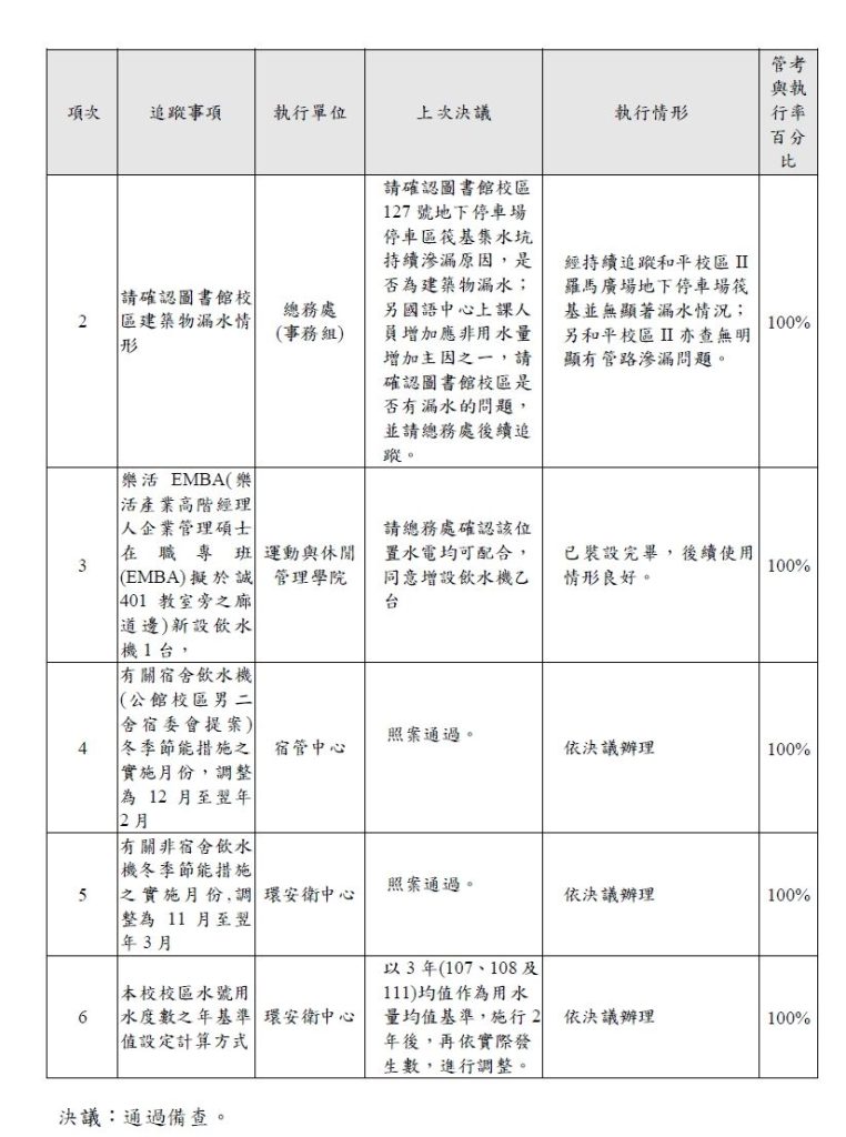 7 | 宿舍飲水機冰水溫度設定於10度℃之節能措施。 | 3月至11月 | 總務處營繕組 環安衛中心 |