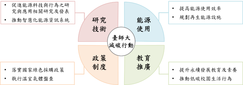To achieve our carbon neutrality goal, our university has developed a carbon reduction action plan across all campus levels, primarily divided into the following four strategic aspects: