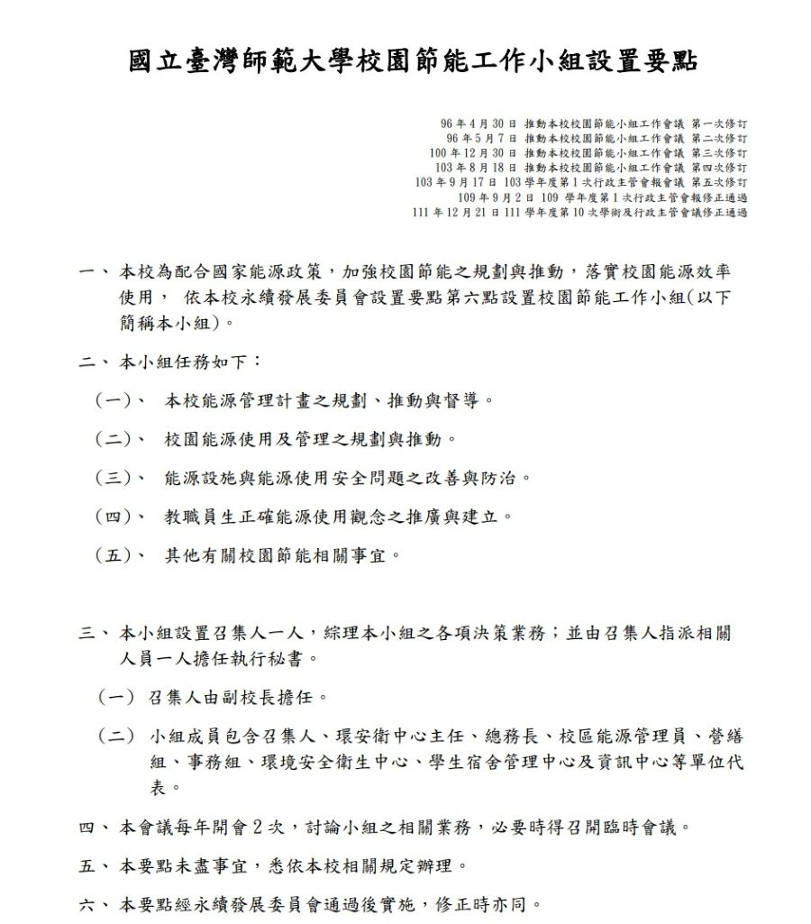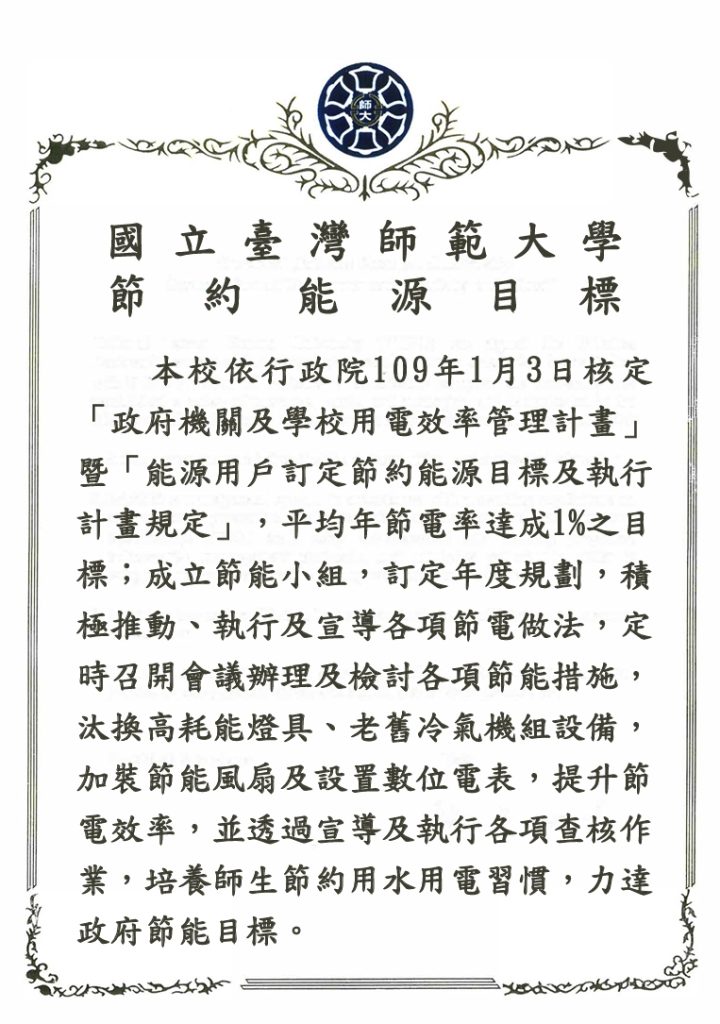 To strengthen the planning and promotion of energy conservation on campus and implement efficient energy use, in accordance with the guidelines for the establishment of the university’s Sustainable Development Committee, the “Guidelines for the Establishment of a Campus Energy Conservation Working Group” have been established. Point 2 (1) of these guidelines defines the task as “planning, promoting, and supervising energy management plans.” An Energy Conservation Promotion Group has been established, with the relevant departments and the university’s vice-principal serving as conveners. The Group will hold at least two meetings annually to review the university’s energy conservation measures, effectiveness, and goal achievement. The university will formulate the National Taiwan Normal University 2024 Energy Efficiency Improvement Plan annually, focusing on reducing overall energy consumption through air conditioning equipment upgrades, improved equipment energy efficiency, lighting equipment, and digital water and electricity meters. An annual energy conservation implementation plan has been established. The 2024 energy conservation measures plan includes: