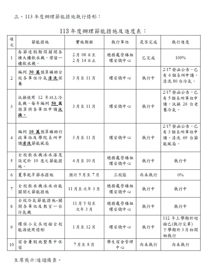 10 | 全校冷氣節能措施-關閉各單位及教室一台冷氣機 | 11月下旬至 次年3月 | 總務處營繕組 環安衛中心 |