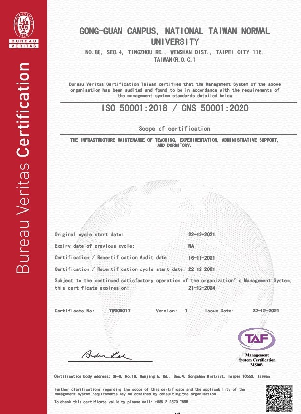 The Gongguan campus has obtained the “ISO 50001 Energy Management System Certification” certificate.