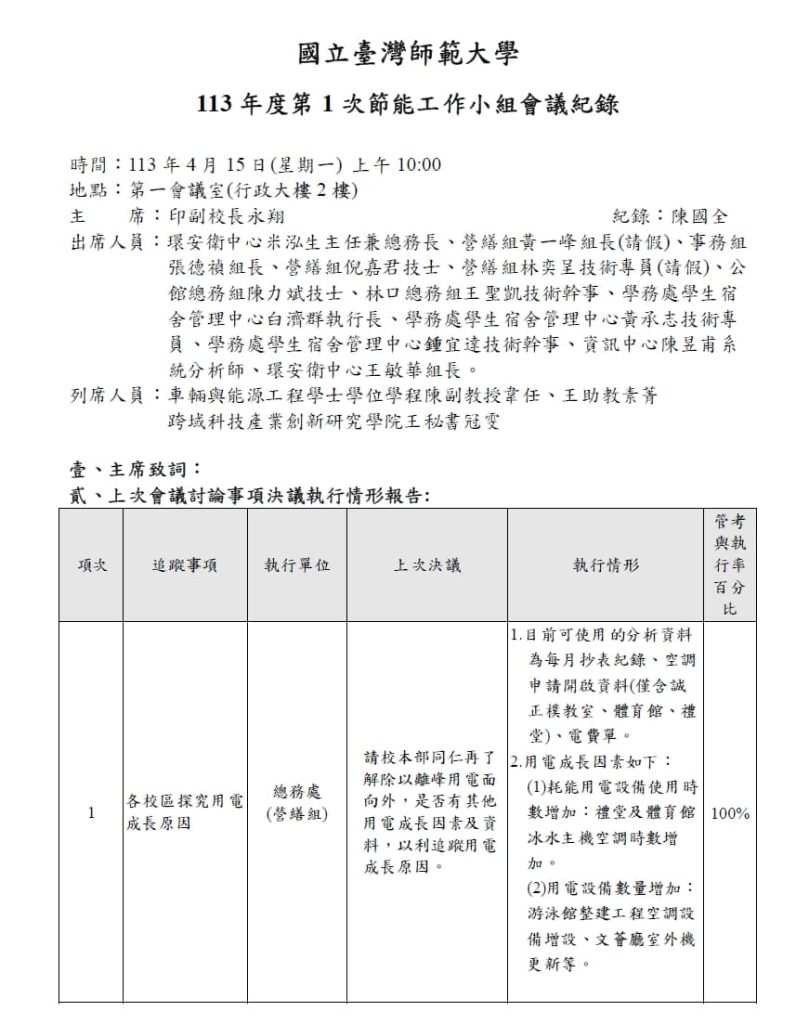 Minutes of the Energy Conservation Working Group Meeting on April 15, 2024: NTNU’s 2024 Energy Consumption Reduction Plan was formulated, including the implementing unit, measures, and progress tracking. progress tracking.