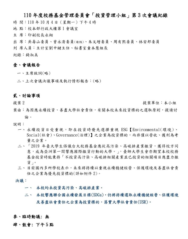 本校投資管理小組會議記錄、本校均未投資高污染、高碳排產業。