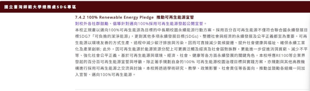 Promoting the 100% Renewable Energy Pledge is considered a key step under the Sustainable Development Goal (SDG 7: Affordable Clean Energy). The university not only actively plans its own campus governance goals and practical solutions for achieving renewable energy but also promotes and encourages more organizations to join in moving towards the goal of 100% renewable energy through academic research, teaching, policy impact, and social responsibility initiatives at meetings and events.