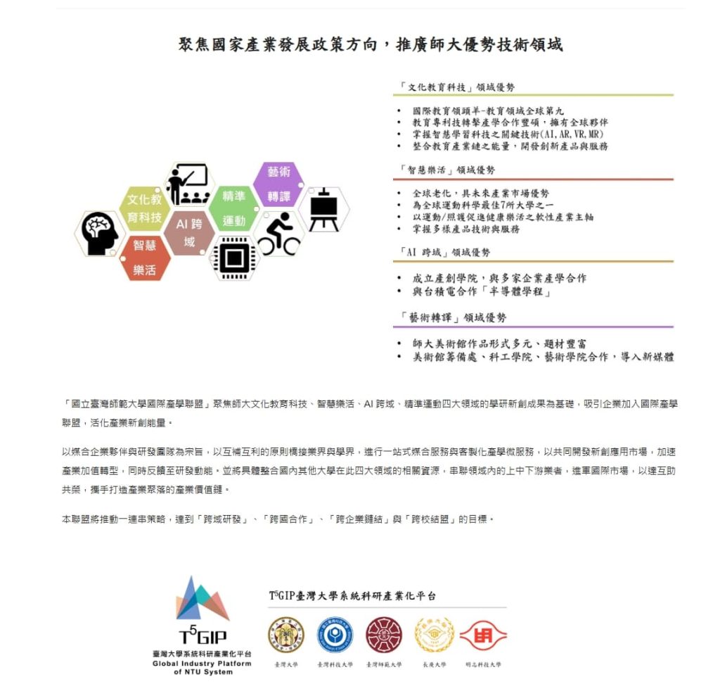 The “National Taiwan Normal University International Industry-Academia Alliance” establishes a research platform within the National Taiwan University system to support government industrial development policies.