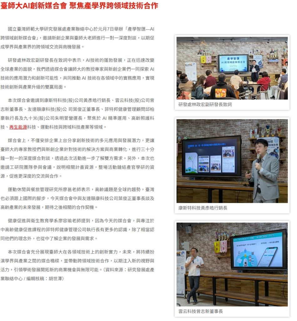 3. NTNU’s Office of Research and Development hosted the “AI Cross-Disciplinary Innovation Matchmaking Conference” to promote exchange and cooperation between startups and professors on renewable energy technology and AI technology. The university integrates renewable energy issues into industry-academia collaboration, youth education, and knowledge dissemination, listing “renewable energy technology” as a key area, connecting resources from industry, government, academia, and research institutions, promoting the technological solutions and commercial applications of energy service companies, and accelerating low-carbon innovation development.